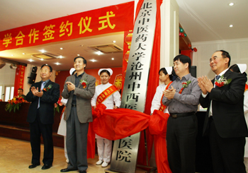 河北滄州中西醫結合醫院院長王立新首先介紹了醫院的發展建設情況。國家中醫藥管理局醫政司司長許志仁對滄州中西結合醫院近年來的快速發展給予了高度評價。他說,作為全國十佳中西結合醫院之一,能夠與北京中醫藥大學建立合作關系,必將使雙方在學科建設以及教學與臨床工作等方面相互促進與提高。王慶國副校長表示,我校作為我國最早成立的高等中醫院校之一,也是唯一進入國家“211工程”建設的高等中醫藥院校,擁有一流的教學科研和師資力量,滄州中西醫結合醫院擁有一定的區域優勢和臨床實踐優勢,校院緊密合作有利于實現優勢互補、資源共享、共同發展,定能互助雙贏,為中醫藥事業的發展做出新的貢獻。段云波局長和周杰處長也分別做了重要講話。簽約儀式后,許志仁司長、王慶國副校長、馬志海副主席、王立新院長共同為“北京中醫藥大學滄州中西醫結合醫院”揭牌。