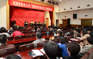 校長助理、教務處處長翟雙慶首先宣讀了我校《關于開展“教風學風建設月”活動的通知》。王慶國副校長強調了開展教學、學風建設的深刻意義和重要作用,并對教風建設提出了要求:各單位要真抓實干,確保各項工作落實到位;教風建設是一項長期工程,要建立長效機制,長抓不懈;在建設過程中逐步歸納、凝練出具有我校特色的教風、學風,不斷傳承;教師在教學中要完善、提升自身修養,鞏固專業思想,做到德藝雙馨;教師要遵守學校的規章制度,規范自身言行舉止,成為學校優良教風學風的帶動者。他指出,教風是學校的立校之本,學校的優良教風和傳統需要回歸,更要發揚,全校師生要齊心協力共同建設良好風氣,使我校真正成為中醫藥行業的首善之校。