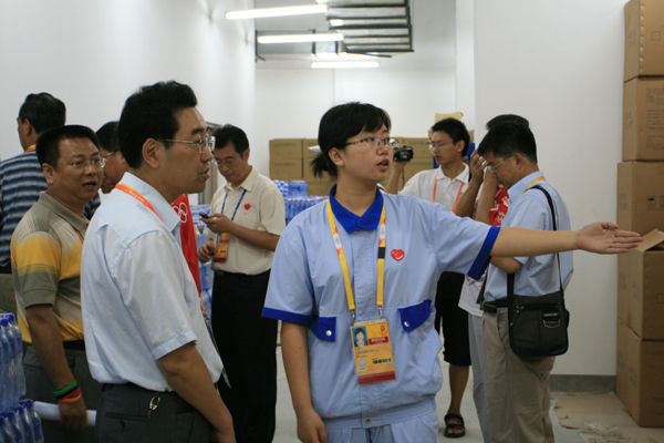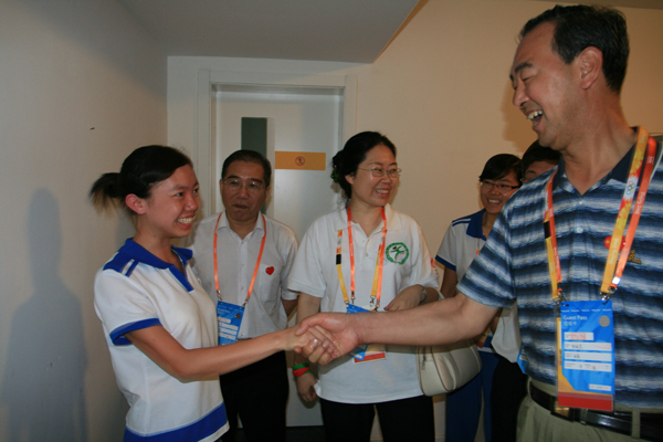 校領導一行先后來到C4樓前臺、C3公寓樓工作間等處,看望了志愿服務的同學們。吳建偉書記對同學們的工作熱情與工作狀態表示了充分的肯定,他希望同學們抓住難得的鍛煉機會,為中國人爭光,為中醫學子爭光。吳書記多次叮囑同學們注意健康,在長時間、高強度的工作期間,注意調節身體狀態,保證以健康的體魄和熱情的態度為奧運做好服務。喬旺忠副書記、魏天卯副校長、谷曉紅副書記、徐孝副校長也分別表達了對同學們的問候。領導們向同學們贈送了奧運微笑圈,鼓勵大家再接再厲,用微笑服務北京奧運。領導們還特地來到地下室,看望了庫房志愿者。志愿者們艱苦的工作環境和辛勤的工作場景,讓領導們頗為感動,他們與志愿者同學親切握手交談并合影留念。