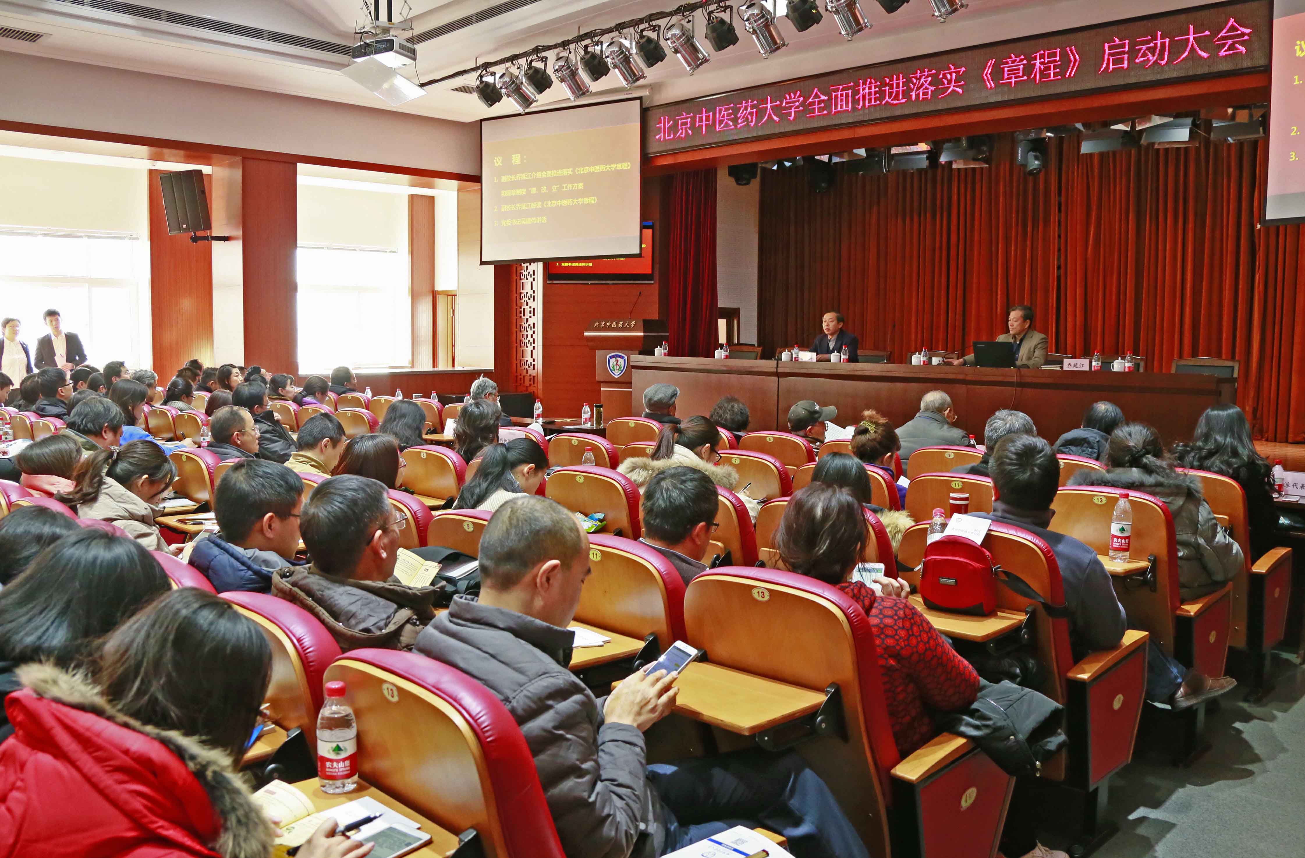12月10日,我校召開全面推進落實《北京中醫藥大學章程》啟動大會暨《章程》解讀專題大會,校黨委書記吳建偉,校黨委副書記靳琦,副校長喬延江、鄔國強,黨委副書記、副校長翟雙慶,副校長王偉,校長助理劉銅華、王耀獻,全體處級干部、教職工代表、民主黨派人士代表、離退休人員代表及學生代表參加了此次大會,大會由校黨委副書記靳琦主持。