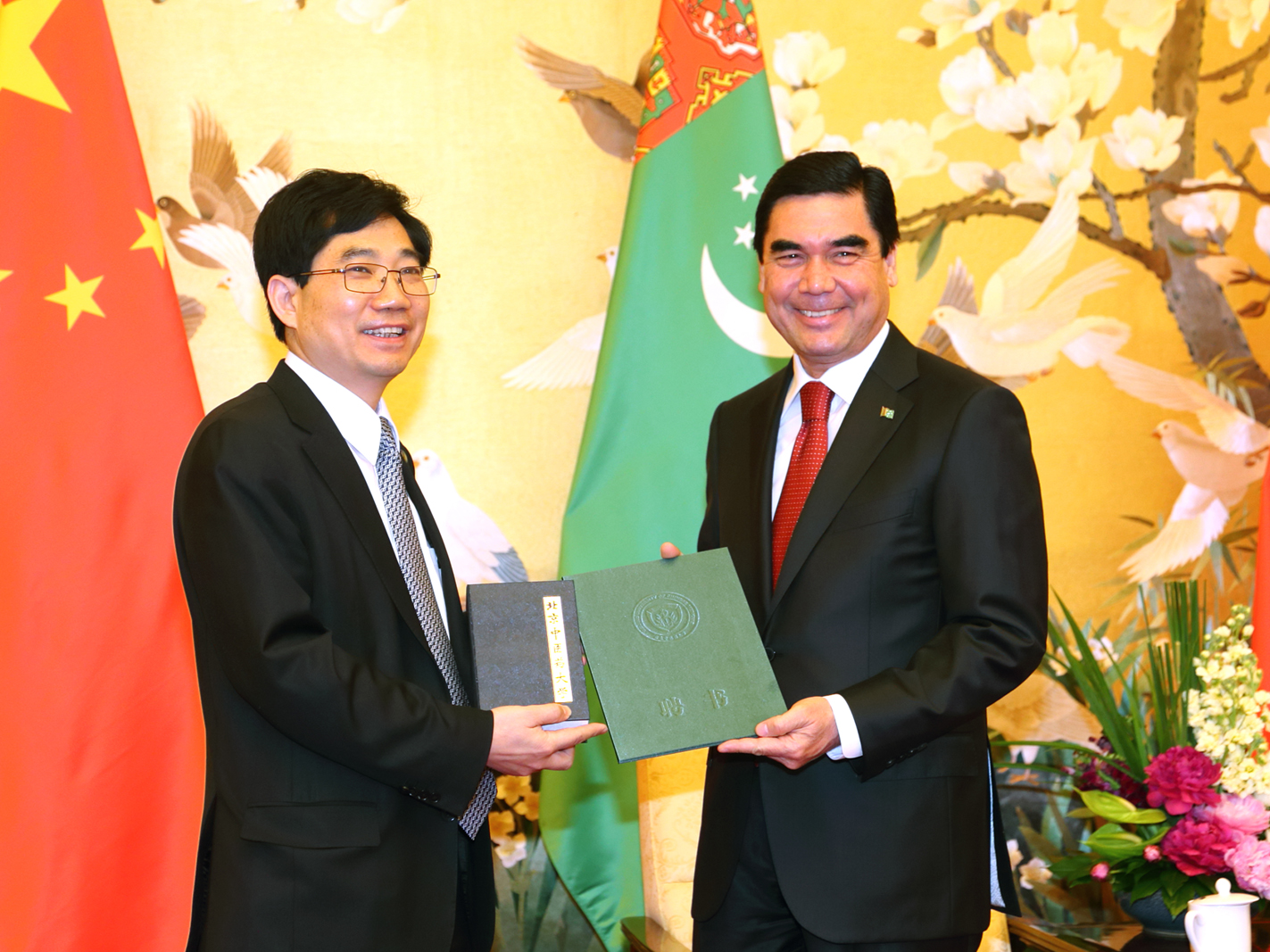 劉延東表示,別爾德穆哈梅多夫總統是中國人民的好朋友,長期關心和推動兩國關系發展,為中土友好合作事業作出重要貢獻。作為土庫曼斯坦國家最高領導人和卓有建樹的醫學專家,總統先生被授予北京中醫藥大學名譽教授稱號,這充分體現了中國人民對土庫曼斯坦人民的深情厚誼。希望雙方以此為契機,擴大兩國傳統醫藥領域互學互鑒,加強人文交往,將中土世代友好的理念傳承下去并不斷發揚光大。