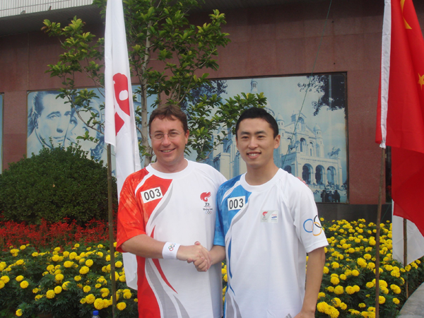 我校奧運火炬護跑手李天罡與火炬手聯合國副秘書長兼環境規劃署執行主任阿西姆·施泰納合影