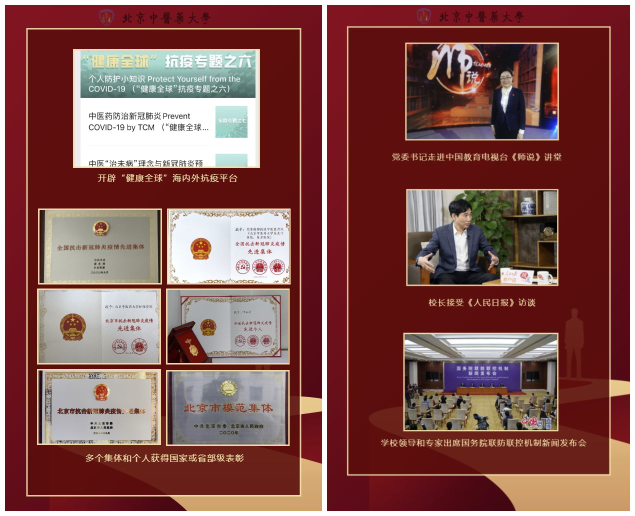 學(xué)校第一時間成立領(lǐng)導(dǎo)小組,全面指導(dǎo)疫情防控。46名醫(yī)護(hù)骨干組成國家中醫(yī)醫(yī)療隊逆行出征武漢,在抗疫一線發(fā)揮中醫(yī)藥救治的重要作用。組建醫(yī)學(xué)專家組,圍繞抗疫開展科技攻關(guān)、遠(yuǎn)程會診,編寫抗疫手冊指導(dǎo)臨床。全體師生齊心協(xié)力,校園防控實現(xiàn)零感染。3000多名學(xué)子志愿服務(wù)家鄉(xiāng)抗疫,“守護(hù)北京”青年突擊隊迎難而上、勇于擔(dān)當(dāng)。開辟“健康全球”等網(wǎng)絡(luò)平臺,面向海內(nèi)外傳播中醫(yī)藥抗疫知識。學(xué)校多個集體和個人獲得國家或省部級表彰。新華社、人民日報、中央電視臺等主流媒體報道北中醫(yī)抗疫事跡1600余次。