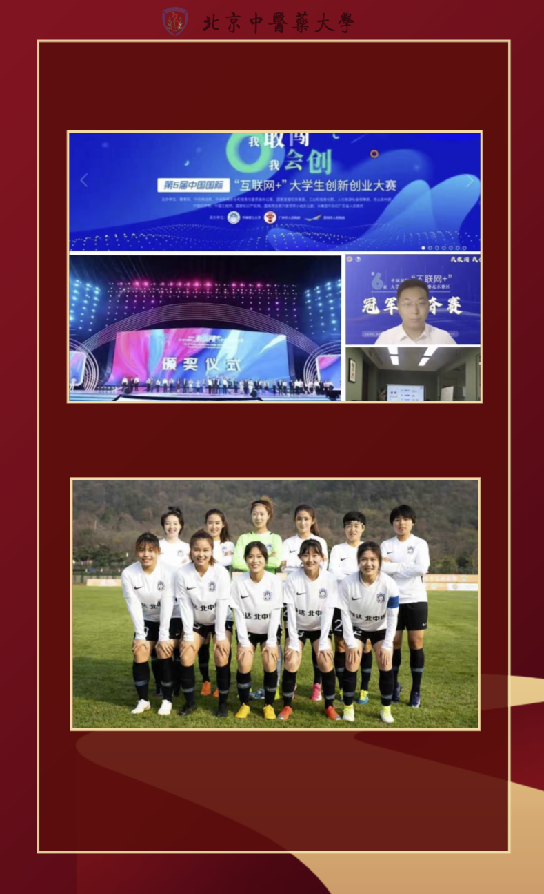 在第六屆中國國際“互聯(lián)網(wǎng)+”大學(xué)生創(chuàng)新創(chuàng)業(yè)大賽中,1支團(tuán)隊獲得國賽銅獎;北京賽區(qū)復(fù)賽中,2支團(tuán)隊獲一等獎、9支團(tuán)隊獲二等獎、33支團(tuán)隊獲三等獎。在北京地區(qū)高校大學(xué)生優(yōu)秀創(chuàng)業(yè)團(tuán)隊評選中,3支團(tuán)隊獲一等獎。校女子足球隊取得2021年甲級聯(lián)賽參賽資格,實現(xiàn)大學(xué)生冠軍聯(lián)賽三年三級跳, 北中醫(yī)學(xué)子風(fēng)采助推學(xué)校美譽度和影響力提升。