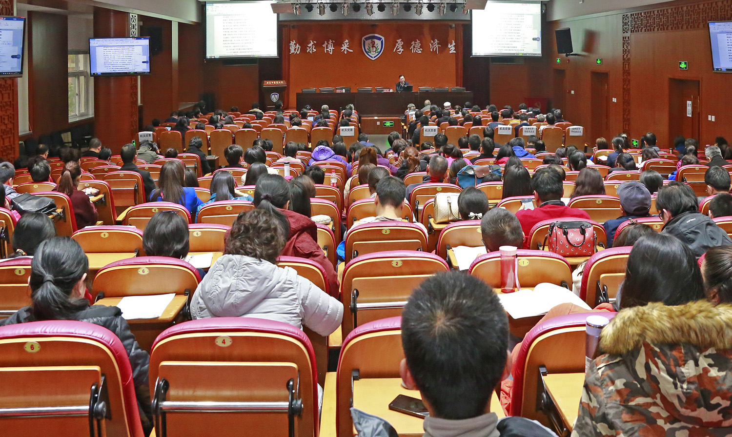 11月18日下午14:00,我校在和平街校區教學樓三層報告廳舉辦十八屆六中全會精神學習專題報告會。大會特別邀請全會文件起草專家作專題報告,校黨委書記吳建偉,副校長谷曉紅,校黨委副書記靳琦,副校長喬延江,校黨委副書記、紀委書記林志華,副校級干部陶曉華出席了會議;全體中層以上干部,全體基層黨委(黨總支)、直屬黨支部書記,全體黨支部書記,馬克思主義學院全體教職工,輔導員、班主任代表等近300人參加了大會。會議由靳琦副書記主持。