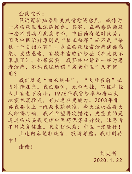 “我一直在臨床一線工作,多次應邀會診呼吸科及內科重癥患者,中西醫結合治療患者,臨床效果都很好!我師承于溫病大師劉景源老師。冠狀病毒性傳染病中醫學就是溫病學的范圍,非典時期我們就總結了很多病歷,并進行了理論研究,面對病毒性疾病,中藥可以說效果顯著。作為一名優秀共產黨員和溫病學臨床一線醫務工作者,在這危機關頭,應該挺身而出,為國家衛生事業做出自己應有的貢獻。”