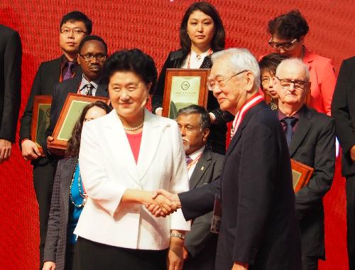 大會開幕式由教育部部長陳寶生主持,國務院副總理、孔子學院總部理事會主席劉延東出席大會并致辭,同時為全球孔子學院先進個人和先進單位進行頒獎。我校在日本合作建立的中醫藥孔子學院理事長、86歲的新家莊平先生,因其對中華文化的摯愛,對中華文化海外傳播、中日兩國中西醫學術交流與合作以及中醫藥孔子學院的迅速發展所做出的突出貢獻,榮獲全球先進個人獎,并接受了劉延東副總理的親自頒獎。