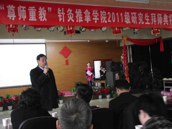 11月30日,“‘尊師重教’針灸推拿學院2011級研究生拜師典禮”在工會活動中心舉行。針灸推拿學院黨總支書記劉清國,院長趙百孝,黨總支副書記、副院長李志剛,副院長于天源及40名博士、碩士生導師出席典禮,全院2011級博士生碩士生和各年級研究生代表參加了拜師典禮。
