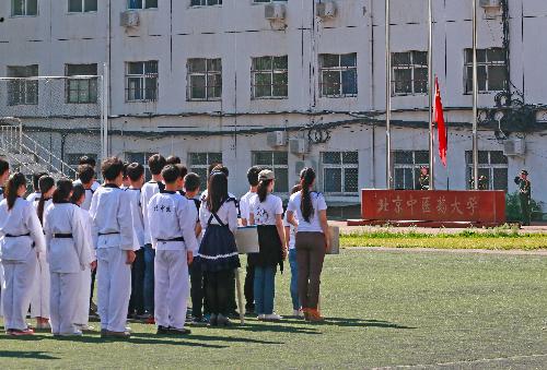 入場式中,首先經(jīng)過主席臺的是由4名國旗班同學組成的國旗方隊和8名校藝術(shù)體操隊女生組成的校旗、會旗方隊,基礎(chǔ)、中藥、針灸推拿、管理、護理、人文各學院以及各體育學生社團、教職工及高水平運動隊和裁判隊伍緊隨其后,千余名教職工及學生神采飛揚地走過。入場式結(jié)束后,全體肅立,在雄壯的國歌聲中目送五星紅旗冉冉升起。