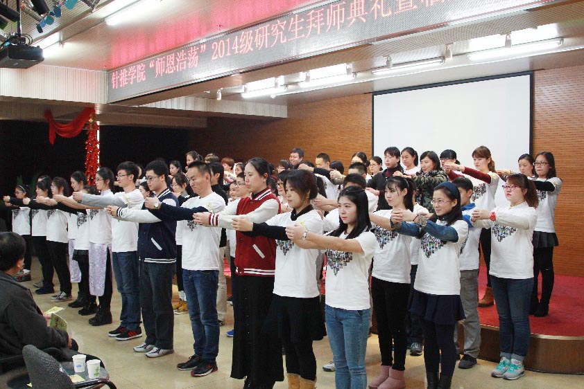 在研究生拜師典禮環(huán)節(jié),導師代表郭長青首先講話。他強調,拜師活動的舉辦不僅僅標志著每一個師門學子的正式入門,同時也讓各位研究生領悟到應該以師門為團隊緊密團結在導師周圍,互幫互助,團結進取,充分發(fā)揮師門的學術、科研及各方面的優(yōu)勢和特色,在研究生的過程中取得最大的發(fā)展。賈文睿同學代表全體2014級研究生向導師們表達了感激和敬意。拜師典禮分為莊重的“集體拜師”和誠摯的各師門“分組拜師”。 研究生們向導師誦讀了拜師詞、行拜師禮,各位導師將寄托希望的《弟子規(guī)》交予弟子,學生們則將《師訓》和懷著感恩之情親手制作的“師門”賀卡贈予恩師。在各位領導、老師及同學們的見證下,整個儀式舉行的莊嚴肅穆。