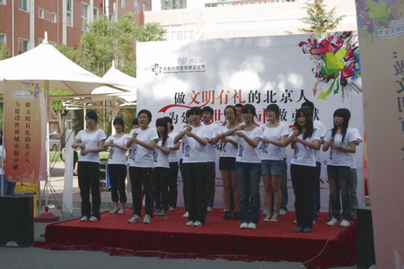 此次校園主題日活動以生動活潑的展示形式和富有創意的活動內容,吸引了眾多同學的關注。同學們紛紛在支持“做文明有禮的北京人”倡議條幅上簽下自己的名字,愿為首都的精神文明建設做出自己的貢獻。在通過展板了解了以往舉辦的活動情況后,很多同學對本次文化節原創DV、動漫創意大賽作品征集等活動表現出濃厚興趣,紛紛詢問參賽事宜。許多同學登上舞臺,與主持人熱情互動,并參與了“你來比劃我來猜”等有趣的游戲。互動環節中,來自基礎醫學院、管理學院、人文學院學生表演的精彩節目博得陣陣掌聲,將活動推向高潮。針灸學院的魏良燕同學認為,通過形式多樣的活動宣傳“做文明有禮的北京人”的理念,對大學生是一種積極的鼓勵和引導,將吸引更多的社會群體的關注與參與。