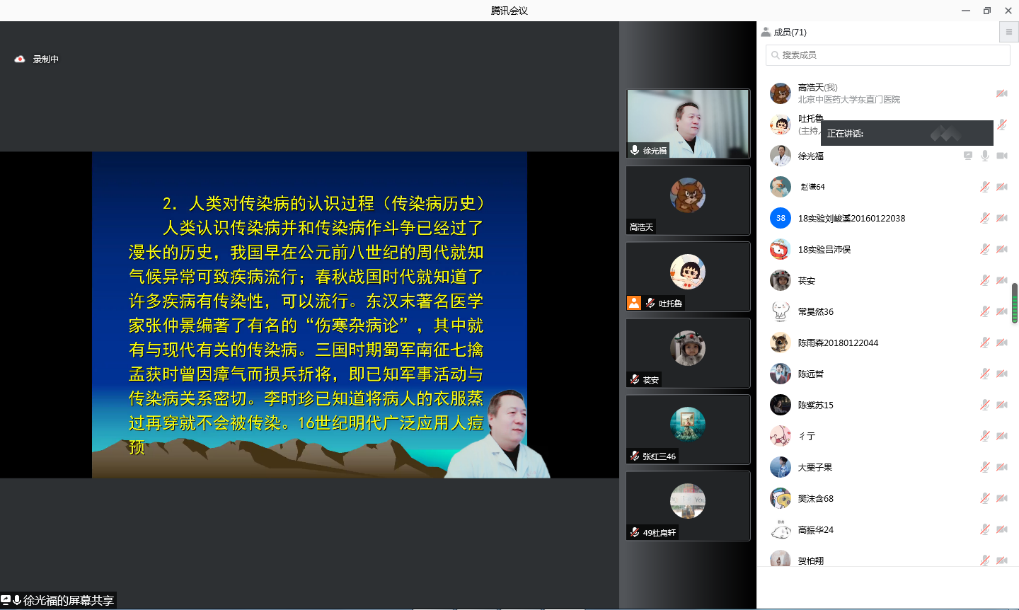 2018級針外班的劉明玥同學說,開學第一天在云端和老師同學們見面了,今天的網課學習十分順利,老師授課耐心仔細,雖然是線上課程,但ppt的內容豐富清晰,課后老師還和我們進行了互動交流。現在大家都很適應上網課了,學習任務也都能保質保量完成,我們要充分利用這段時間調整作息和心態,制定新學期的計劃,回到學校后和同學們一起享受美好的校園生活。