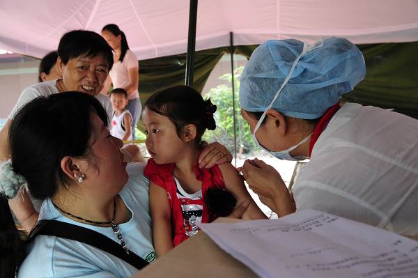 醫(yī)療隊員為德陽市女孩接種甲肝疫苗