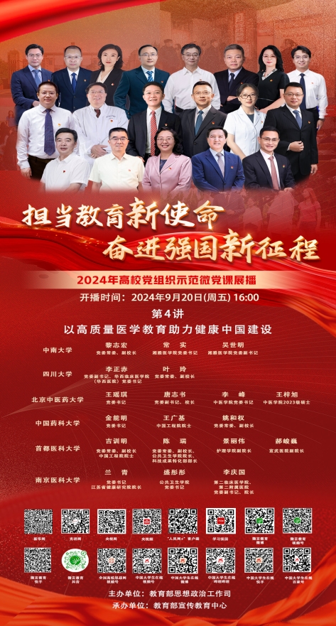 近日,2024年高校黨組織示范微黨課《擔當教育新使命,奮進強國新征程》第4講《以高質量醫學教育助力健康中國建設》上線播出。 2024年高校黨組織示范微黨課展播活動由教育部思想政治工作司主辦,教育部宣傳教育中心承辦。