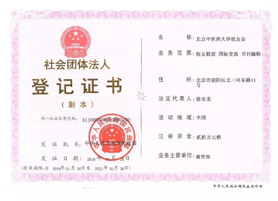 2016年1月26日,北京中醫(yī)藥大學(xué)校友會(huì)在民政部注冊登記成立,成為民政部一級社團(tuán)組織。