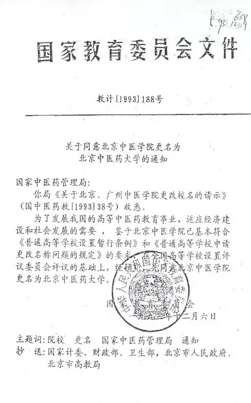 1993年12月,經(jīng)國家教委批準(zhǔn),北京中醫(yī)學(xué)院更名為北京中醫(yī)藥大學(xué)。