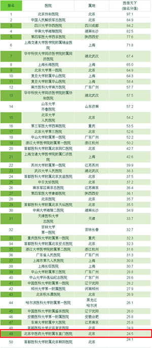 8月18日,中國醫學科學院醫學信息研究所“醫信天下”網公開發布“2014年度中國醫院影響力50強排名榜”,從全國三級甲等醫院中,以技術評價和綜合評價為考察指標評選出前50強。我校附屬東直門醫院是唯一一家榜上有名的中醫院。