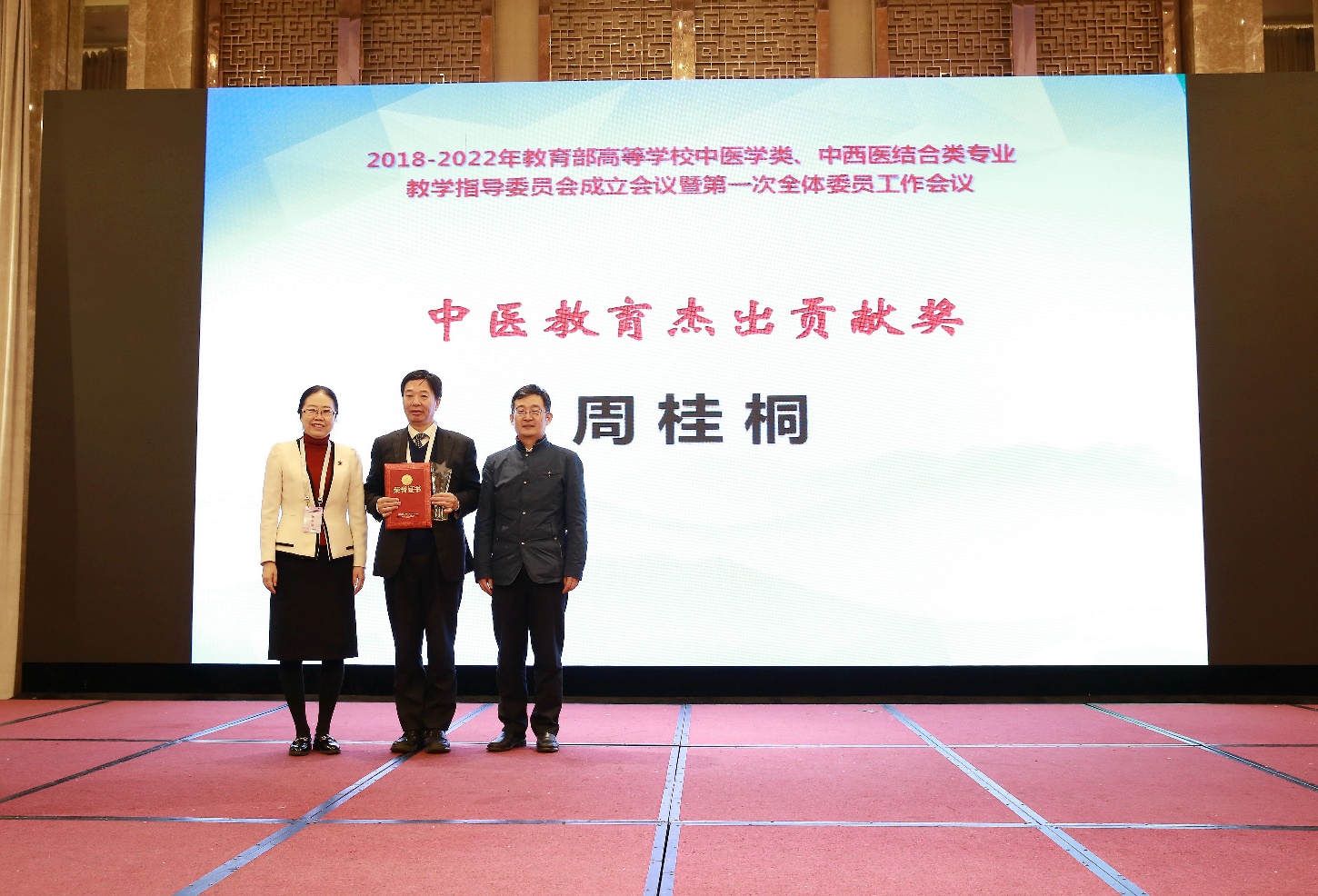 中醫學類專業教學指導委員會谷曉紅主任委員宣讀了《關于授予張伯禮院士中醫教育終身成就獎的決定》和《關于授予周桂桐教授中醫教育杰出貢獻獎的決定》,高斌處長和谷曉紅主任委員共同為張伯禮院士和周桂桐校長頒獎,以表彰他們在中醫教育中做出的突出貢獻。