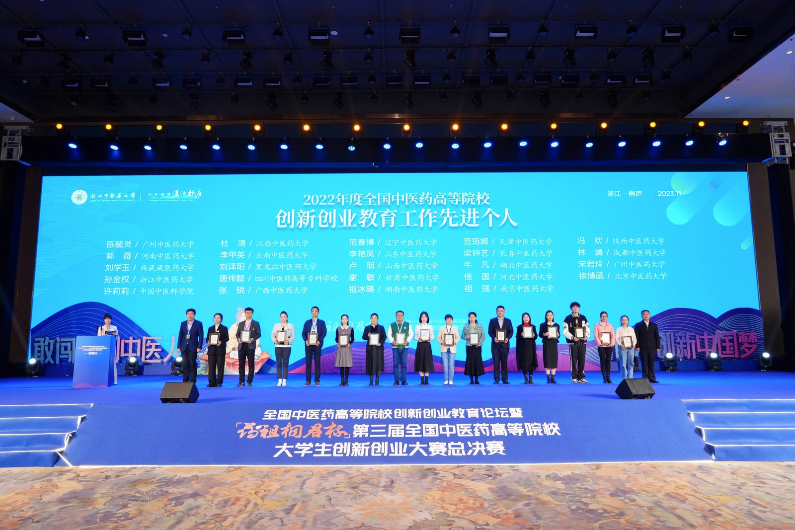 在閉幕式上,來自北京中醫藥大學、浙江中醫藥大學、河南中醫藥大學三支金獎團隊進行了項目展演。全國中醫藥高等教育學會創新創業教育研究會常務理事、秘書長田潤平宣讀了2022年度全國中醫藥院校創新創業教育工作系列獎項的表彰決定。我校陳衛衡、魏勝利教授分別獲評“創新創業項目優秀指導教師”。徐博函獲評“創新創業教育工作先進個人”。宋萌、張少輝等撰寫的論文獲評“創新創業優秀論文一等獎”,馬思雍、邵悅等撰寫的論文獲評“創新創業優秀論文二等獎”,賈曉蕾撰寫的論文獲評“創新創業優秀論文三等獎”。