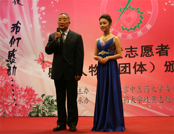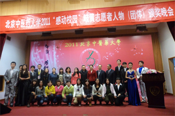 12月5日,我校岐黃志愿者協會舉辦了2011“感動校園”岐黃志愿者人物(團體)頒獎晚會。光明日報原總編、全國人大農委委員、我校訪問學者茍天林,校黨委副書記谷曉紅,副校長徐孝、靳琦,團市委大學部部長張秀峰,北京志愿者聯合會項目部副部長鄒江宏,北京朝陽寸草春暉養老院老護理院院長王小龍,北京市紅十字會基金會癌癥救助基金癌癥救助網趙曉雁,北京市紅十字會造血干細胞志愿者之家王靖楠,和平街殘疾人聯合會會理事長林鴻燕,北京同仁堂公司營銷分公司總經理張宏宇,我校優秀志愿者代金剛及校團委、各學院老師出席晚會。