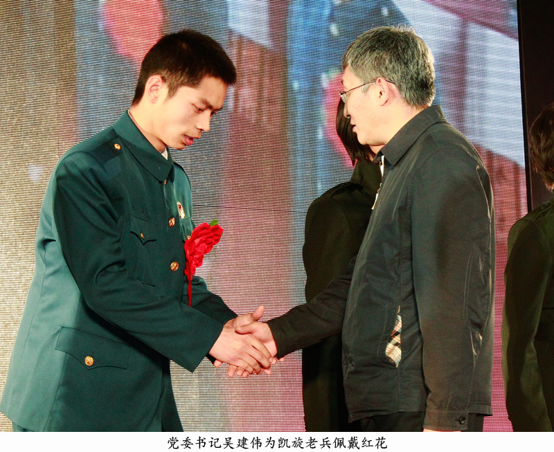 在頒獎典禮上,5名今年役滿復學的“老兵”,邁著鏗鏘有力的步伐,滿載著他們在軍隊的榮譽與收獲向學校報到。他們嘹亮的口號,整齊劃一的行動,真情流露的話語,令在場師生感慨唏噓,5位校領導為他們佩戴鮮艷的紅花,將典禮氣氛推向高潮,頒獎典禮在校歌《承諾》聲中圓滿落幕。