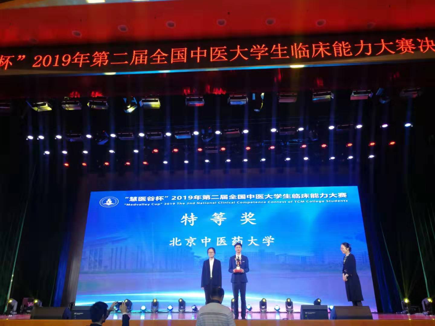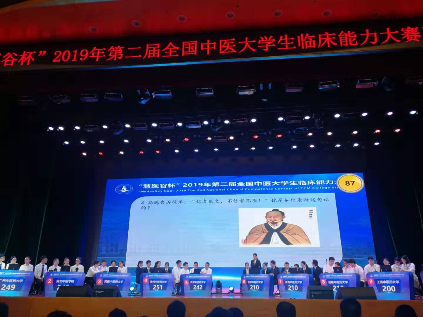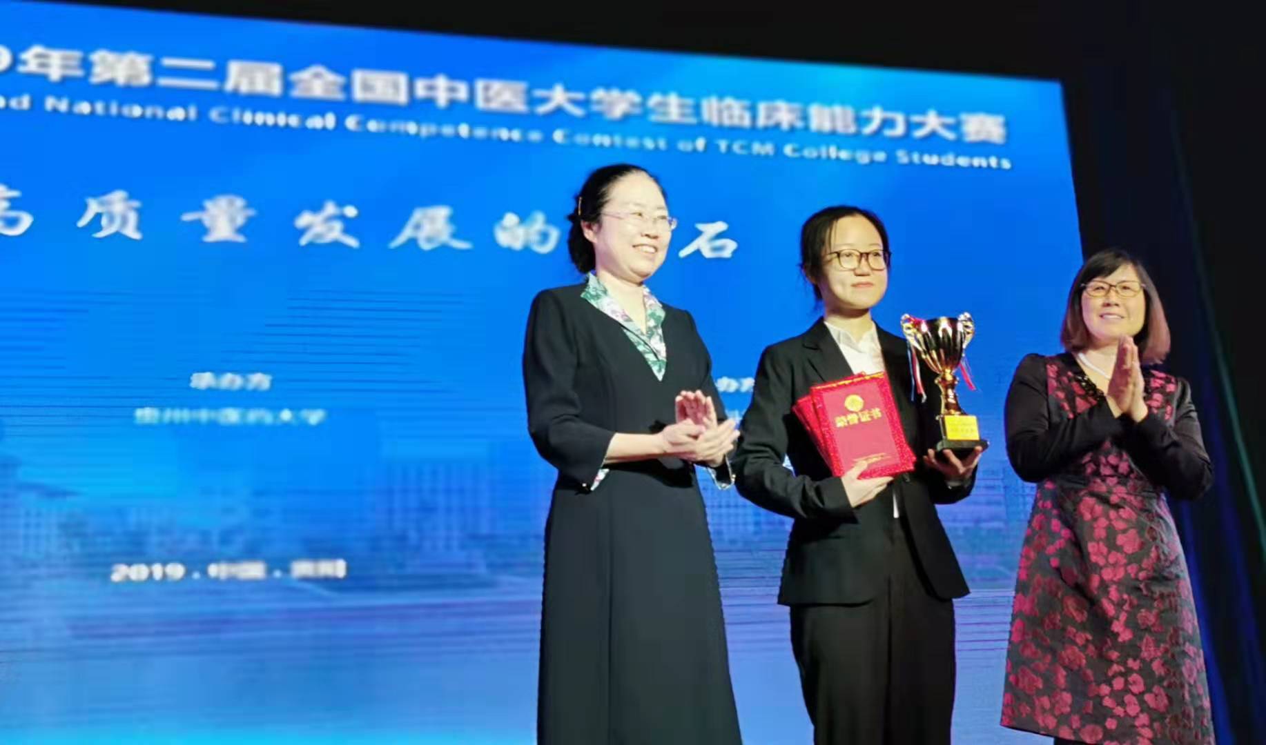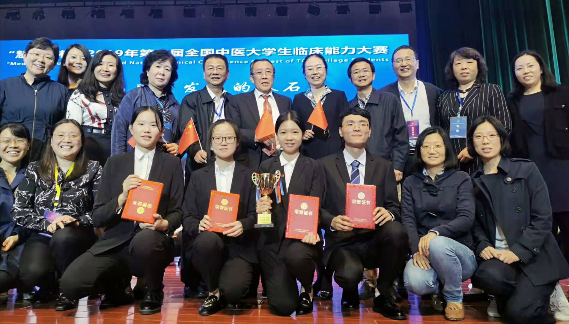 10月10至14日,“慧醫谷杯”2019年第二屆全國中醫大學生臨床能力大賽在貴州貴陽舉行。本次大賽由教育部高等學校中醫學類專業教學指導委員會和全國中醫藥高等教育學會主辦,貴州中醫藥大學承辦。共有來自全國的39支隊伍150余名選手參加。我校代表隊勇奪團體特等獎,并獲得個人單項獎1項。教育部中醫學類專業教學指導委員會主任、我校黨委書記谷曉紅為獲獎選手頒獎。