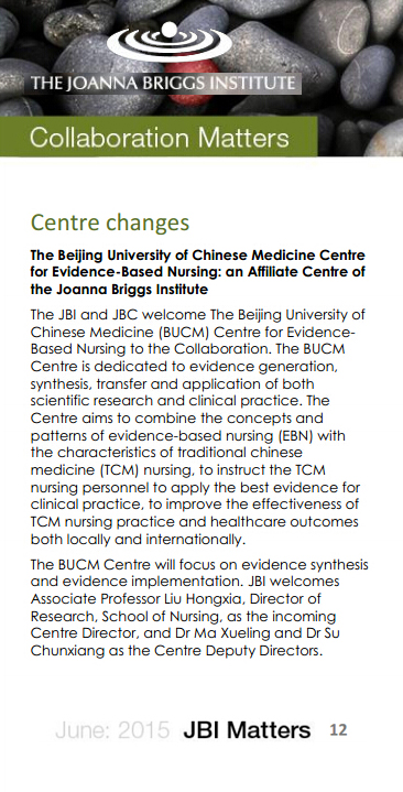 2015年6月,澳大利亞JBI循證衛(wèi)生保健研究中心(Joanna Briggs Institutions,JBI)在其中心網(wǎng)站正式發(fā)布北京中醫(yī)藥大學(xué)成為澳大利亞JBI循證護理合作中心。北京中醫(yī)藥大學(xué)JBI循證護理合作中心是中國大陸第三家循證護理合作中心,也是全球第一家從事中醫(yī)護理的循證護理合作中心。我校護理學(xué)院劉紅霞教授任中心主任,蘇春香和馬雪玲任副主任,北京中醫(yī)藥大學(xué)循證醫(yī)學(xué)中心主任、北京中醫(yī)藥大學(xué)基礎(chǔ)醫(yī)學(xué)院院長劉建平,復(fù)旦大學(xué)護理學(xué)院院長、復(fù)旦大學(xué)Joanna Briggs Institutions合作中心主任、上海市循證護理中心主任胡雁及北京中醫(yī)藥大學(xué)護理學(xué)院院長郝玉芳任顧問。