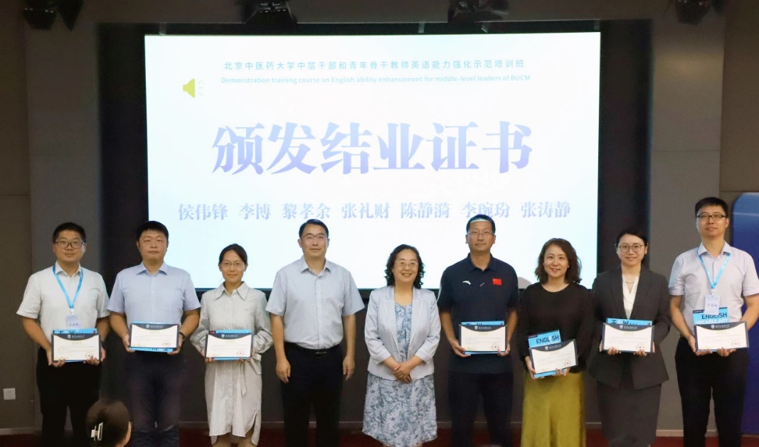 8月23日,由北京中醫藥大學主辦、北京外國語大學承辦的“北京中醫藥大學中層干部和青年骨干教師英語能力強化示范培訓班”順利結業。北京中醫藥大學黨委書記王瑤琪,北京外國語大學黨委常委、副校長丁浩,北京中醫藥大學黨委組織部常務副部長李彧,黨委教師工作部部長、教師發展中心主任龔燕冰等參加活動。結業儀式由北京外國語大學外研社黨委副書記陳媛媛主持。