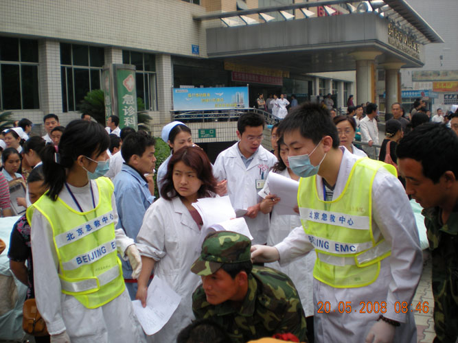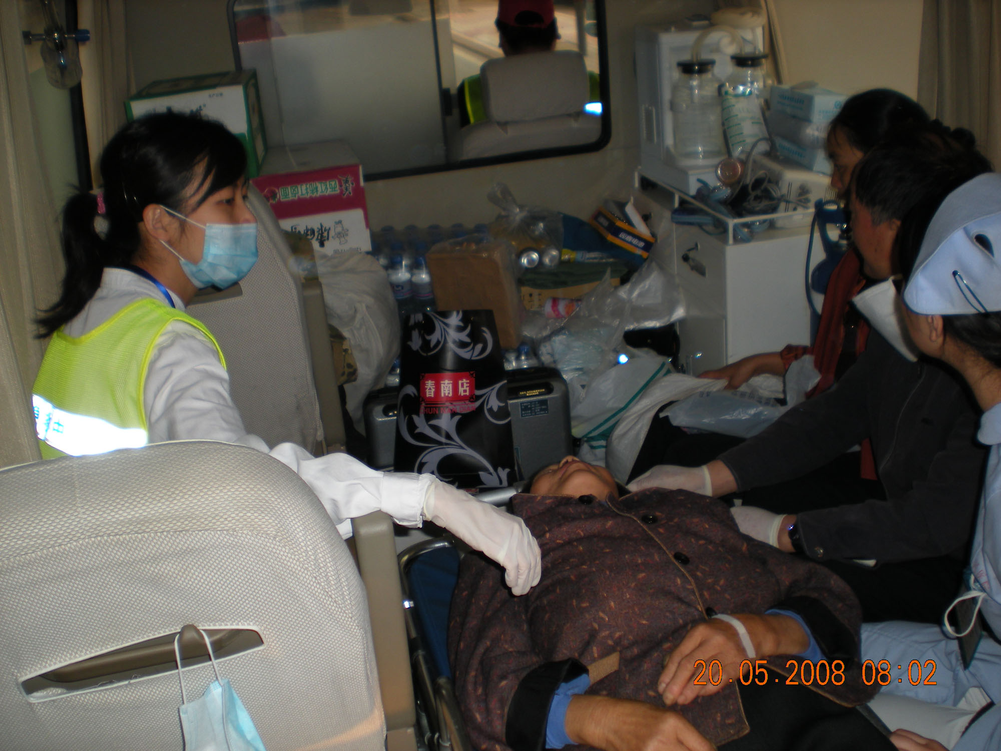 5月18日,我們由成都驅車至綿陽市,將404醫院的病人轉至重慶,并連夜趕路,于19日早晨返回綿陽,繼續運送病人。30多個小時之間,我們不眠不休往返于四川大地,每個人的臉上充滿疲憊,但是大家看到傷員及時得到醫治,都倍感欣慰。在隨后的幾天,我們行程數千公里轉運病人,得到北京急救指揮部的高度贊揚,為大學和醫院贏得了榮譽。