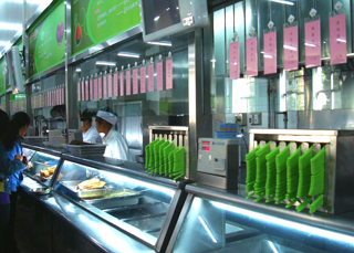 為提升食堂服務質量,加強食品衛生安全和質量監督,今年開學以來學校和后勤處有關領導對食堂服務工作進行多次巡檢和指導。副校長靳琦、后勤處處長孫傳新在檢查東校區食堂工作時,提出東校區食堂設立餐勺架和有機玻璃菜牌是值得學習借鑒的好做法。餐飲服務中心隨即利用現有條件,在東西區食堂統一采購、統一價格的基礎上,開展統一服務標準的工作,結合西區人員流量,定做了餐勺架和有機玻璃菜牌。