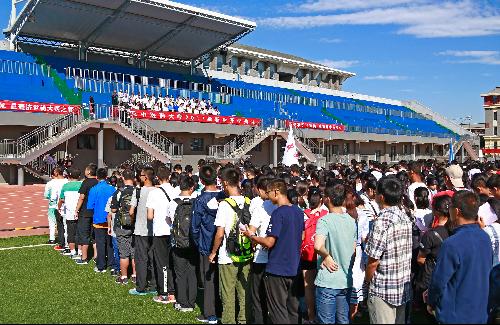 我校國旗班邁著鏗鏘有力的步伐護衛國旗入場,鮮艷的五星紅旗在國歌聲中揚起,在全體師生的注目下冉冉上升,開學典禮由此拉開序幕。