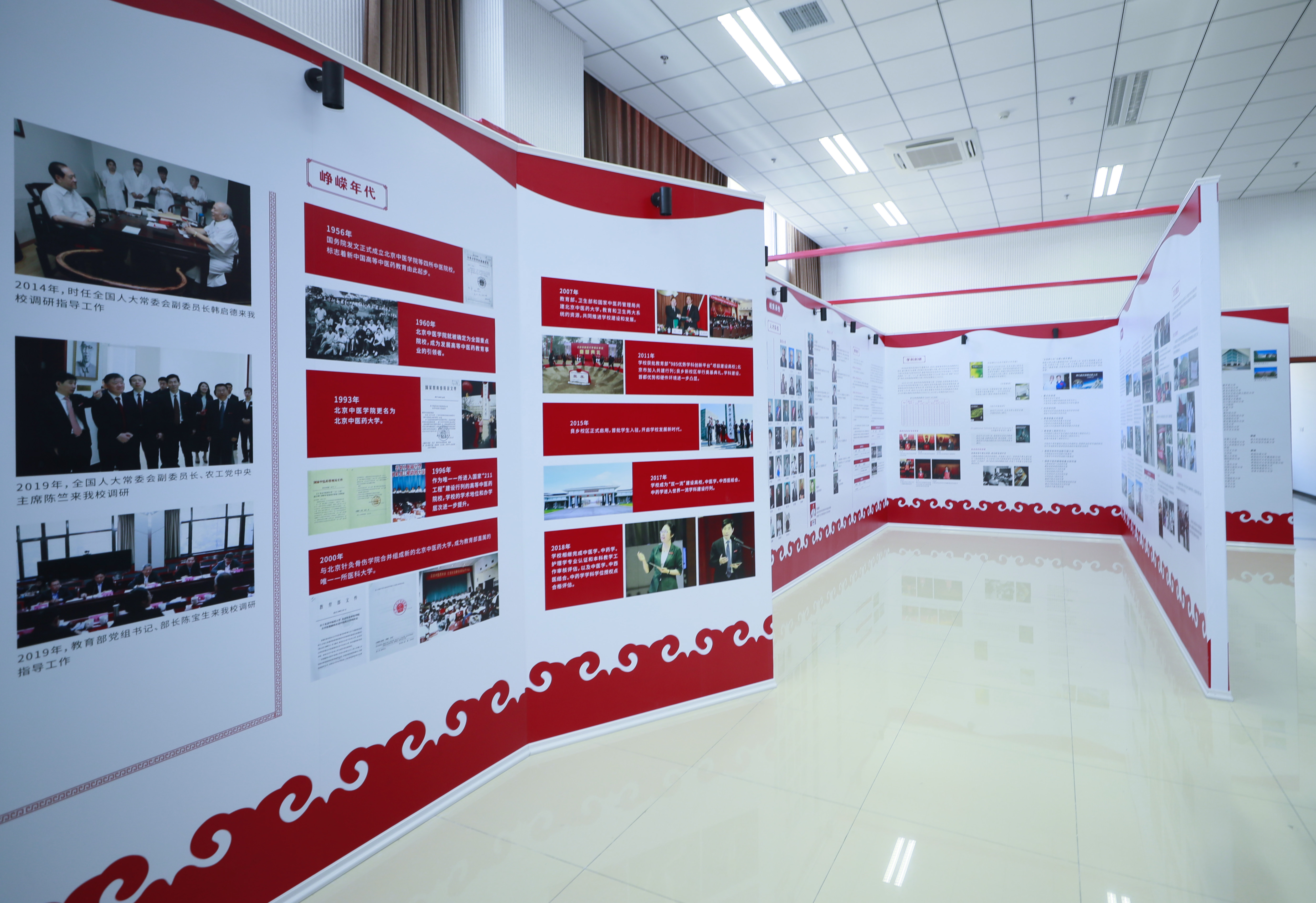 展覽中的一幅幅圖畫、一段段文字,記錄著北中醫人拼搏與奮進的厚重篇章。1956年北京中醫學院成立,標志著新中國高等中醫藥教育起步。1960年被確定為全國重點院校。1996年進入國家“211工程”建設行列,到2017年成為“雙一流”建設高校,學校各項事業發展不斷邁上新臺階。