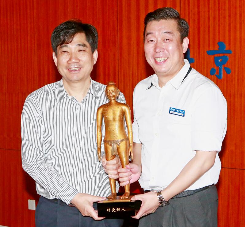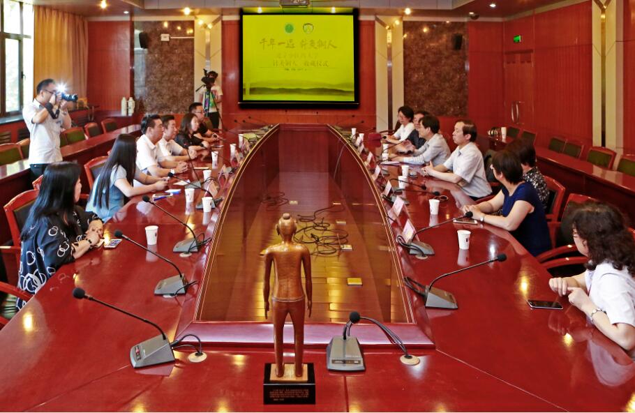 6月1日下午,至尊版“針灸銅人”收藏儀式在我校中醫(yī)藥博物館舉行。為響應(yīng)國家大力發(fā)展中醫(yī)藥的政策號召,迎接7月1日《中醫(yī)藥法》的施行,由國家中醫(yī)藥管理局主管世針針灸交流中心發(fā)起,我校針灸推拿學院教授谷世喆積極推薦與聯(lián)絡(luò)促成本次捐贈。至尊版“針灸銅人”是由北京工美集團有限責任公司限量出品。