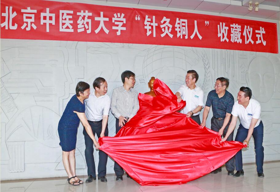 收藏儀式上,徐安龍校長致歡迎辭。徐校長強調(diào)了針灸銅人的歷史意義,以及對中醫(yī)發(fā)展所做出的貢獻,肯定了中國人在醫(yī)學上、科技上輝煌的歷史成績,并且強調(diào)針灸銅人見證了中醫(yī)針灸發(fā)展歷史上的輝煌。他指出,古老的中國醫(yī)學科技輝煌成就在醫(yī)學史上有其重要的地位,對增強民族和文化自信,激勵當代、甚至是后代起到重要作用。儀式最后,徐安龍與靳琦、谷世喆、張少鵬、楊軼、盧穎一同為針灸銅人揭幕。