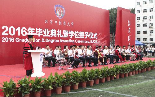 6月28日上午,北京中醫藥大學2016年畢業典禮在西校區體育場隆重舉行。原國家衛生和計劃生育委員會副主任、我校78級校友陳嘯宏、校黨委書記吳建偉、校長徐安龍、副校長谷曉紅、副校長喬延江、黨委副書記、紀委書記林志華、副校長鄔國強、副校長王偉、校長助理王耀獻、劉銅華出席典禮。學院黨政領導、臨床醫學院黨政領導、職能部門領導、教師代表、輔導員代表、班主任代表、學生家長及2016屆全體畢業生參加了典禮。畢業典禮由校黨委副書記、副校長翟雙慶主持。