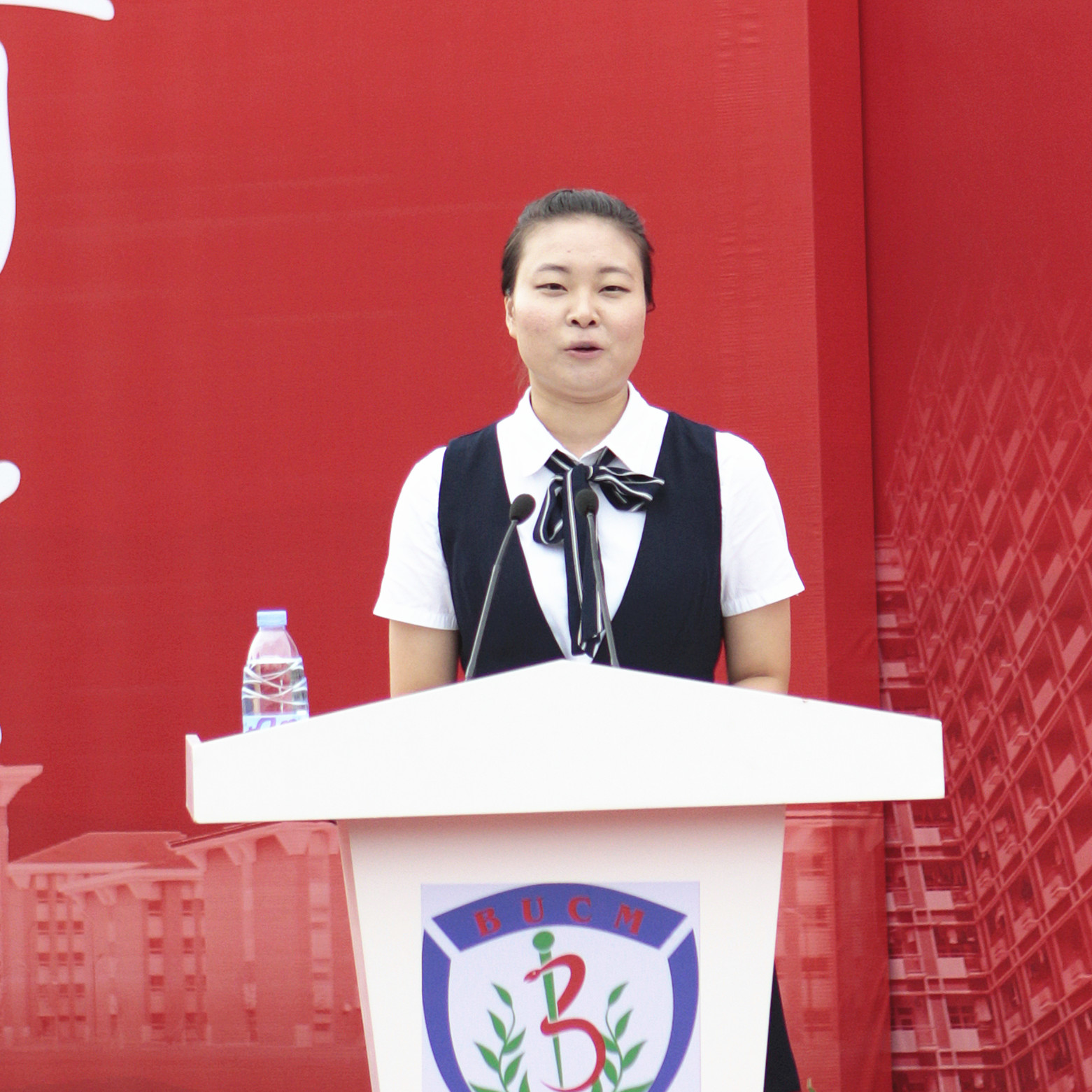 本專科畢業生代表, 針灸推拿學院2011級針灸推拿專業學生孫新月發言。她分享了從入學到畢業五年間的許多收獲。她表示,未來將會帶著母校的期望走向漫漫征途,做為杏林學子,向祖國承諾,向人民承諾,勤求博采,厚德濟生的校訓必將相伴一生。