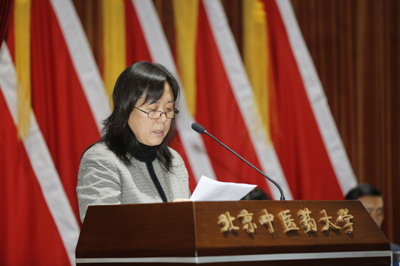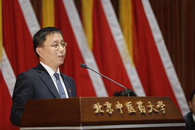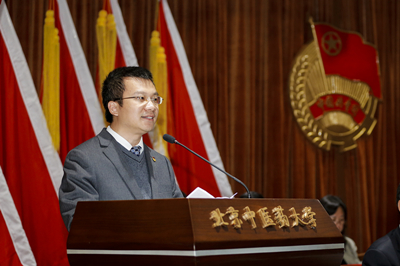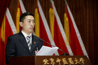 隨后,李驥部長受團中央書記處傅振邦書記的委托,代表團中央學校部、全國學聯秘書處向大會的召開表示熱烈的祝賀,向長期以來關心和支持學生會、研究生會工作的學校黨政領導和各個職能部門表示衷心的感謝,也向各位代表以及全校的團員師生青年表示熱烈的問候。李驥部長對我校近年來共青團工作給予高度認可。他說,北京中醫藥大學的團學組織堅持圍繞中心統顧大局,在慶祝反法西斯勝利70周年閱兵、世界田徑錦標賽等志愿服務工作以及全國大學生“三下鄉”活動中都有出色的表現,謹遵學校立德樹人,以文化人的宗旨,堅持走高品質有內涵校園模式化建設的路線,精心創造了全國首部中醫藥文化題材的原創校園舞蹈詩“岐黃志”,將藝術教育、思想教育高度融合。在組織青年,引導青年,服務青年方面做了大量有效的工作,為學?!半p一流”的建造和發展做出了突出的貢獻,為高校共青團學生會、研究生會工作起到了一定的促進推動作用。范杰同學在講話中也對我校共青團工作給予了極大的認可并希望北中醫以本次大會為契機全面總結自己的成功經驗,圍繞學校中心工作,以強烈的使命感、責任感自覺肩負起時代賦予的重任。