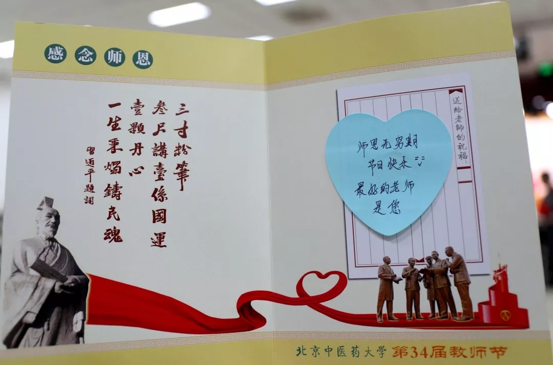 為迎接第34個教師節,我校開展了一系列活動。校領導和相關職能部門負責人走訪慰問了離退休老教師。9月3日起,良鄉校區與和平街校區同時開展以“祝福您,親愛的老師”為主題的、學生對教師的祝福語征集,學生在彩紙上寫下對老師的祝福語,粘貼在宣傳板上,網絡線上征集活動同步進行。工作人員將所有的“祝福語”匯總制成了“祝福樹”,在教師節表彰大會當日現場展示,吸引許多教師駐足欣賞,合影留念,祝福語還貼在北中醫原創的教師節賀卡里,讓這份心意永久留存。