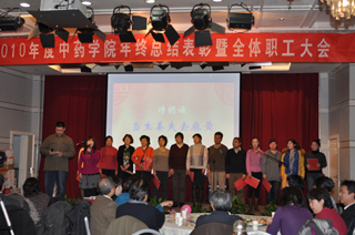 校黨委書記吳建偉教授為大會作了總結性發言。吳書記首先對中藥學院2010年的工作成績給予了充分肯定,并對中藥學院今后的工作提出了建議和要求。吳書記指出,要如期完成中藥學院十二五規劃中的指標,需要全院職工的共同努力,更離不開學校全面的支撐和幫助。在新的一年里,學校將從多方面做出努力,為各學院的發展提供有力保障:首先在拓寬學校、學院辦學空間方面,學校將把做好新校區的建設工作作為重中之重,建設中醫藥的首善校園,全面解決目前整體硬件條件的局限問題;第二,在調動員工積極性方面,學校將構建更加科學的工資體系,實現職工待遇的穩步增長,使廣大教職工信心更強、工作更積極,使我們的教職工團隊凝聚力更強;最后,在如何激勵教師爭取科研合作方面,學校將加大支持橫向科研課題力度,加大獎勵力度,以此鼓勵與拉近各學科的合作,也希望中藥學院在今后的工作中能夠加大對橫向課題的支持力度,開發出更多新藥,使專利技術的開展更加廣泛。最后,吳書記代表校領導和各職能部門向為中藥學院的建設和發展做出貢獻的獲獎教師表示了祝賀和感謝,為全院教職工送上了新春的問候。希望中藥學院教職工繼續以飽滿的工作熱情投入工作,爭創佳績。