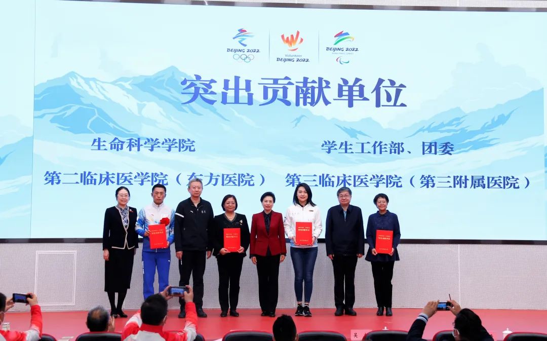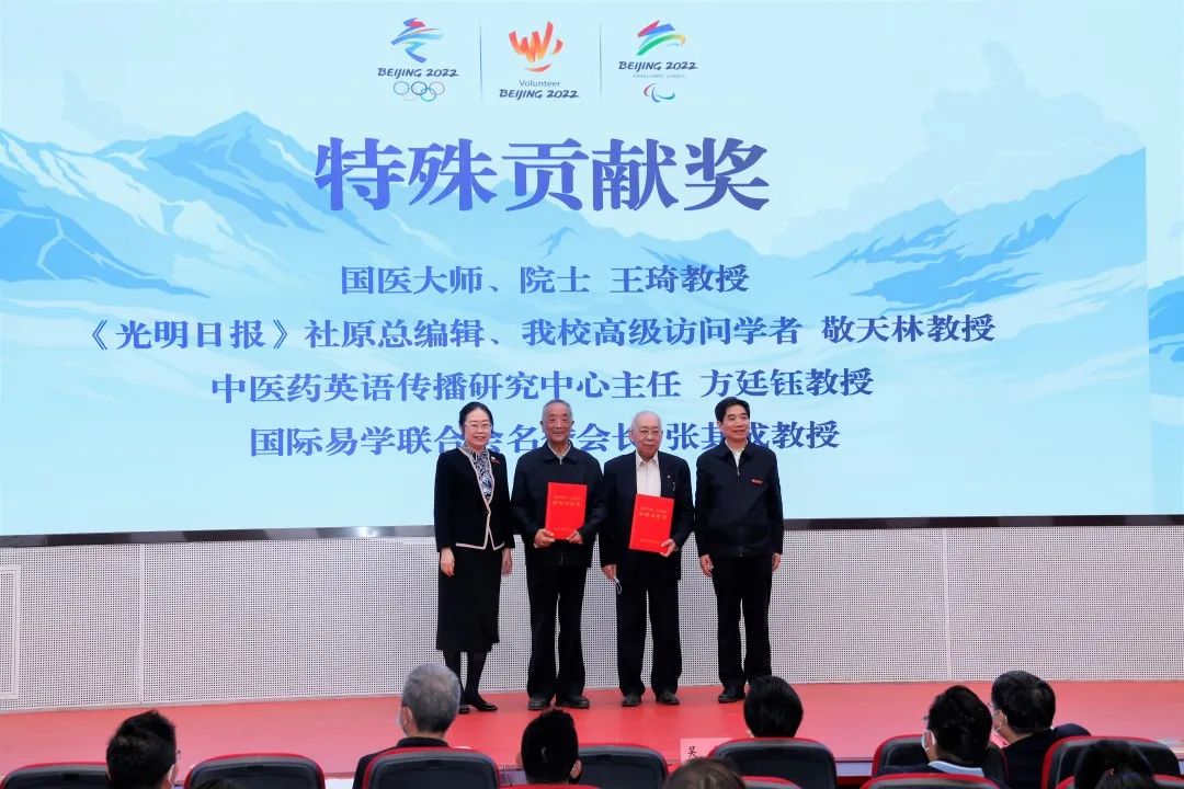 會上,校長徐安龍宣讀了《中共北京中醫藥大學委員會關于表彰“北京中醫藥大學服務2022年北京冬奧會、冬殘奧會”突出貢獻單位和突出貢獻個人等獎項的決定》。授予中國工程院院士、國醫大師王琦教授,《光明日報》原總編輯、我校高級訪問學者茍天林教授,中華中醫學會翻譯分會顧問、世中聯翻譯委員會首席顧問方廷鈺教授,國際易學聯合會名譽會長張其成教授特殊貢獻獎。授予生命科學學院、學生工作部(團委)、第二臨床醫學院(東方醫院)、第三臨床醫學院(第三附屬醫院)4個單位突出貢獻單位獎。授予李天罡等59名師生突出貢獻個人獎。授予黨委宣傳部等22個單位優秀組織單位獎。授予史雨宸等297名師生優秀志愿者獎。