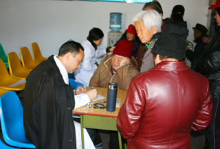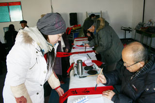 雖然天氣寒冷,但同志們熱情高漲,義診服務(wù)項(xiàng)目包括中醫(yī)內(nèi)科、西醫(yī)內(nèi)科、骨科、外科、B超等。老師們仔細(xì)查看病情,詢問情況,絲毫不馬虎。有的老師細(xì)致地向村民講解疾病的發(fā)生機(jī)理和生活注意事項(xiàng),宣傳保健知識(shí),受到村民的熱烈歡迎。校書法協(xié)會(huì)陳壽泉、陳樹寶、史鳳歧三位老同志還義務(wù)為村民寫春聯(lián)、送福字,村民們爭相領(lǐng)取,供不應(yīng)求。