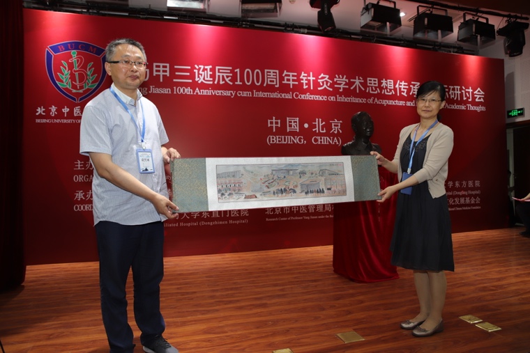 研討會上舉行了楊甲三先生銅像揭幕儀式。儀式上,南京中醫藥大學張建斌教授代表澄江針灸學派致辭并贈送繪卷。