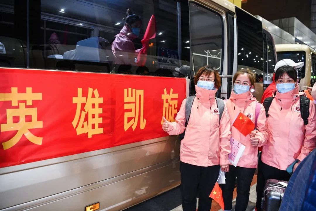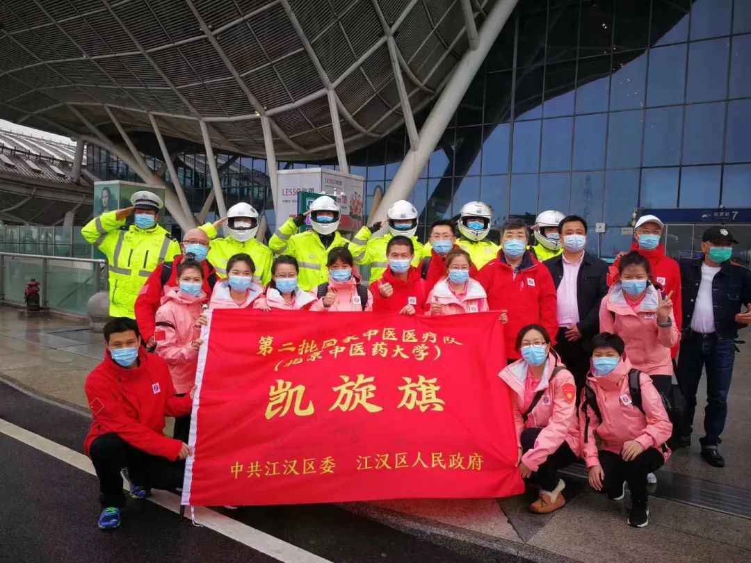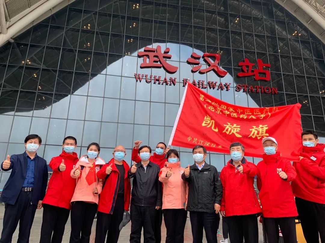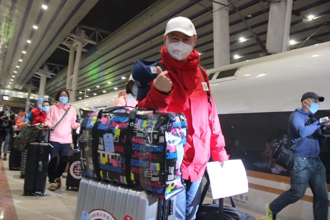 在武漢站,大家舉著“凱旋旗”合影留念。 醫(yī)療隊隊員、第一臨床醫(yī)學院(東直門醫(yī)院)急診科護士紀冬梅用手比心,笑著說,“炸醬面永遠會跟熱干面在一起!我們一起加油!”