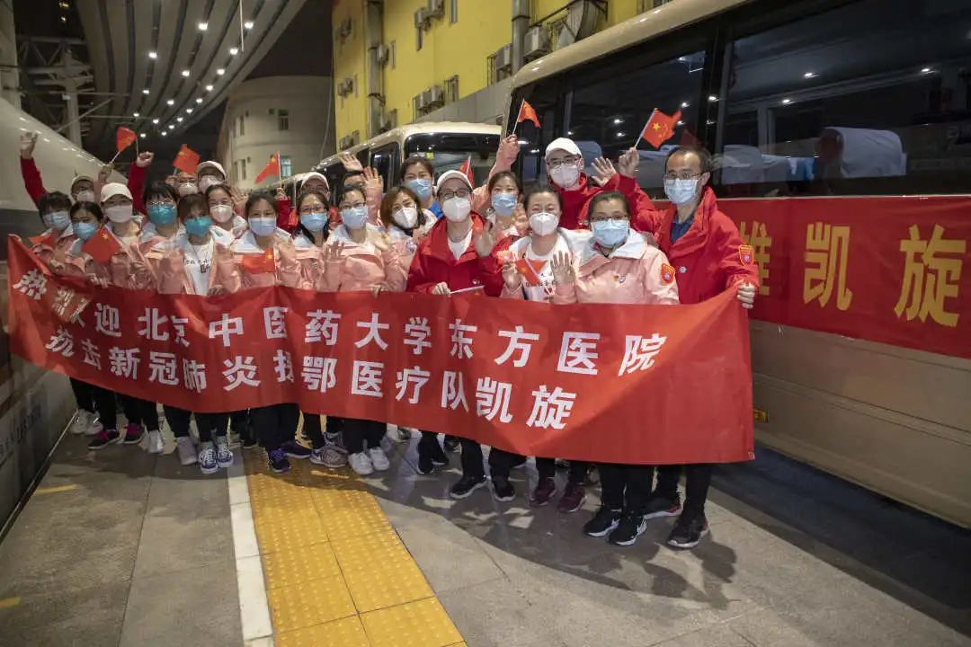 3月25日21時10分, G68次列車緩緩開進北京西站,在抵京的人群中,有一群特殊的旅客,他們是來自北京中醫(yī)藥大學第一臨床醫(yī)學院(東直門醫(yī)院)、第二臨床醫(yī)學院(東方醫(yī)院),已在武漢前線奮戰(zhàn)59天的46名國家援鄂中醫(yī)醫(yī)療隊隊員。戰(zhàn)“疫”英雄們完成了援助醫(yī)療任務(wù),今天撤離武漢市,晚上回到北京。站臺上,迎候人員早早列隊等候,隨著醫(yī)療隊員走出車廂,站臺上響起了熱烈的掌聲。