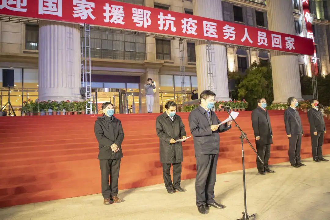 國家中醫(yī)藥管理局人事教育司司長盧國慧、副司長閆冰和我校黨委書記谷曉紅、副校長王偉、附屬醫(yī)院領(lǐng)導來到站臺迎接歸來的醫(yī)療隊員。谷書記對醫(yī)療隊員深情地說,“我非常想念你們,歡迎你們回家,你們辛苦了。你們不顧個人安危逆行千里,是最可愛的人,是戰(zhàn)士,是英雄!”返京的醫(yī)療隊員們乘坐專用車輛前往駐地,進行為期14天的隔離休整。中華全國總工會、國家衛(wèi)生健康委、國家中醫(yī)藥管理局、北京市順義區(qū)有關(guān)領(lǐng)導,我校校長徐安龍和附屬醫(yī)院領(lǐng)導在駐地為隊員們舉行了簡短的歡迎儀式。國家中醫(yī)藥管理局局長于文明和全國總工會黨組書記、副主席、書記處第一書記李玉賦分別致辭和講話。徐安龍校長與醫(yī)療隊隊員們“隔空”握手,一一問候。