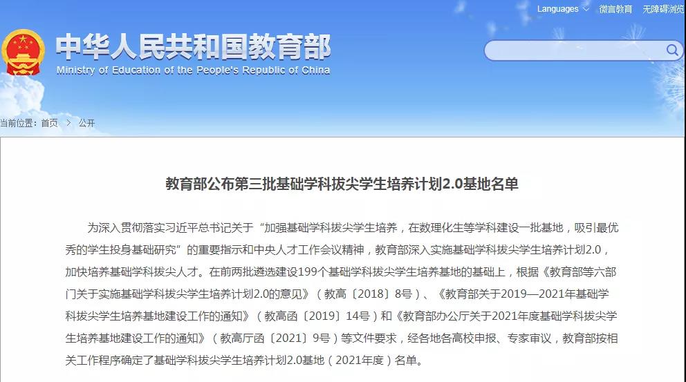 九、拔尖創新人才培養能力再提升,獲批教育部基礎學科拔尖學生培養計劃2.0基地