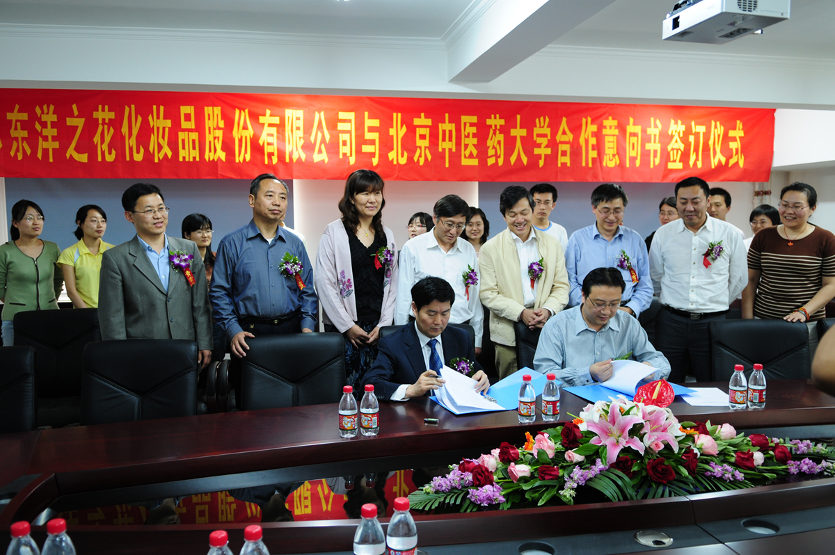 5月20日,“江蘇東洋之花化妝品股份有限公司與北京中醫藥大學合作意向書簽約儀式”暨“北京中醫藥大學·東洋之花—肌膚健康研究所揭牌儀式”在我校中藥學院中藥科技發展部隆重舉行。校黨委書記吳建偉、校長高思華,校長助理、中藥學院院長喬延江,科技產業處處長劉銅華,中藥學院黨總支書記索潤堂,東洋之花化妝品有限公司董事長方宜新、總經理莊毅、上海東洋之花化妝品有限公司總經理周潔等出席儀式。儀式由劉銅華處長主持。校長高思華首先代表學校致詞,高校長表示:雙方合作是產學研相結合,根據市場需求,利用企業和大學的優勢,發揮中醫藥特色,以滿足人們回歸自然的追求,為老百姓提供高質量的民族品牌,此次合作必將開創美好的明天。東洋之花化妝品有限公司董事長方宜新表示,雙方經過半年的了解、洽談,建立在化妝品領域的戰略合作伙伴關系,對雙方都是難得的機遇。中醫藥是我國的民族瑰寶,此次合作有利于發揮各自優勢,開發具有中醫藥特色的化妝品,實現中醫藥在化妝品領域的創新,創建民族品牌。肌膚健康研究所所長劉勇博士、副所長周潔女士表示對雙方合作充滿信心。校黨委書記吳建偉做總結發言,他對研究所寄予厚望。他相信雙方合作有利于發揮人力、智力、技術優勢和企業的優勢打造民族品牌,必將不斷取得新成果。