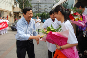 6月2日下午,我校附屬東直門醫(yī)院第二批抗震救災醫(yī)療隊凱旋歸來。副院長龐鶴、黨委副書記解志葆前往機場迎接。這批隊員到達災區(qū)后,立即進入救災現(xiàn)場,積極運送傷員,為數(shù)十名傷員爭取到最佳搶救的時間,挽救了他們的生命。醫(yī)院黨委書記楊晉翔早早等在門口,隊員們一下車,楊書記上前噓寒問暖,感謝大家為災區(qū)人民作出的貢獻,感謝大家為大學和醫(yī)院贏得榮譽。他希望大家好好休息,以充沛的精力重返工作崗位。
