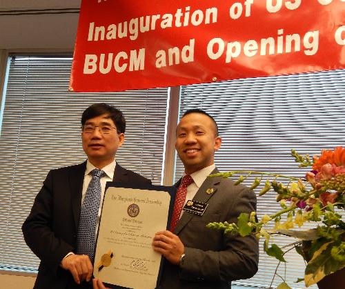 2016年12月17日上午,北京中醫藥大學美國中醫中心落成暨中醫藥博物館開業儀式在馬里蘭州舉行。中國駐美國大使館公使銜參贊兼總領事唐立、馬里蘭州參議員Susan Lee、眾議員Clarence Lam、國際貨幣基金組織副總裁張濤、美國華盛頓中華醫學研究所所長兼臨床中心主任及前白宮補充和替代醫學政策委員會委員田小明、北京中醫藥大學校長徐安龍教授共同為“北京中醫藥大學美國中醫中心中醫藥博物館”剪彩,標志著美國首個集中醫教育、醫療、科研和文化交流功能為一體的中醫中心正式落成。