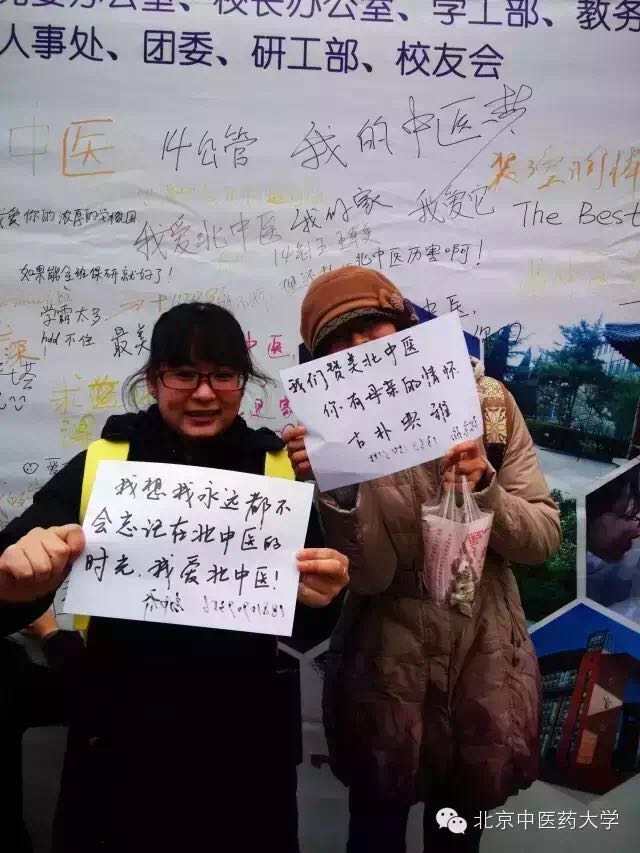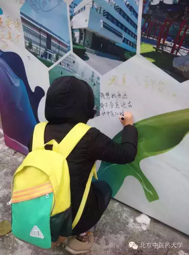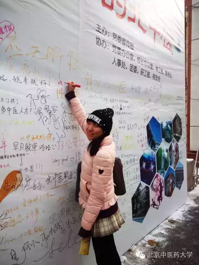11點開始,很多師生陸續來到籃球場西側廣場上,大家或熱情揮灑筆觸在背景板上寫下心中的北中醫,或在鏡頭前用真摯的話語表達自己的心聲和感言。現場的學生記者團用相機和dv記錄下了每個瞬間。背景板上寫滿了“北中醫像家一樣”、“懷仁心以濟世,鑄就我的中醫夢”、“中醫殿堂,夢想階梯”、“馬中赤兔,醫中圣家”、“北三環東路最美的一角”等文字。